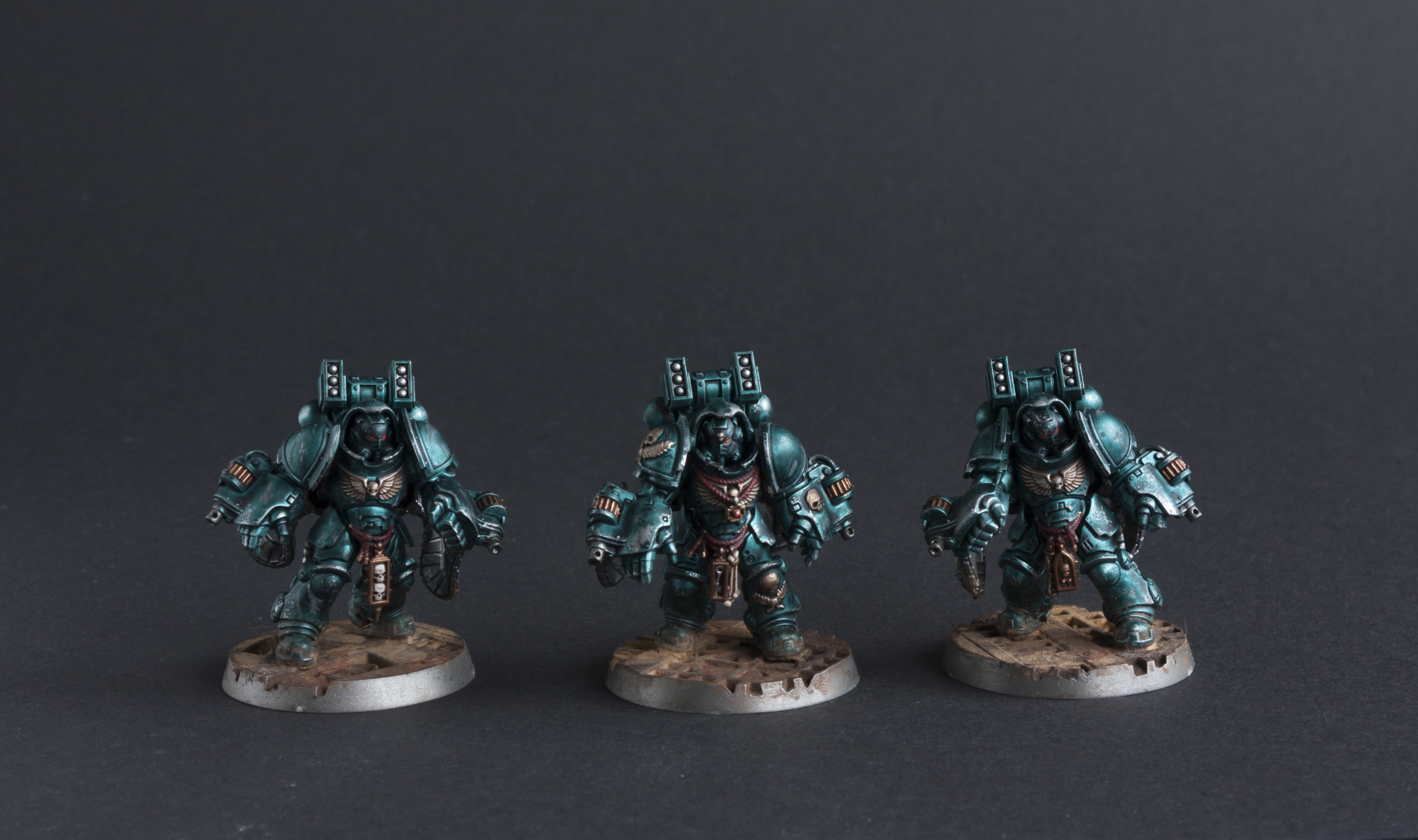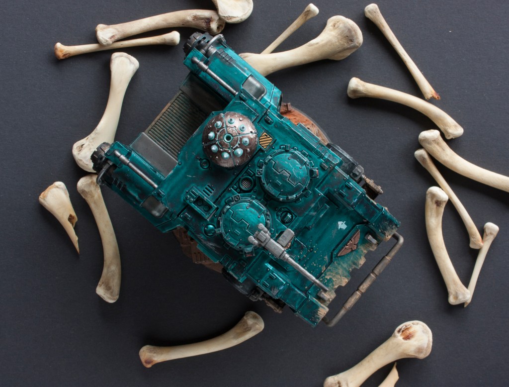 The idea grew and grew in my head. What color? What models? And so on. I learned about the new -at least new for me- contrast colors and I saw what awesome effect you can create if you paint them over metallic paint. I wanted something popping, something that stands out on the table, something that has a nice effect to it. So after watching a lot of contrast paint review videos and looking at color charts of metal/contrast paint tests I just went for one of my favourite color. A green turquoise. In my head heavily weathered, battleworn, but still kind of candy-ish. After a few tests with the new paints on some old testmodels I found the right recipe for what I was looking for. It’s super easy and fast and I’m so happy everytime I look at the models.