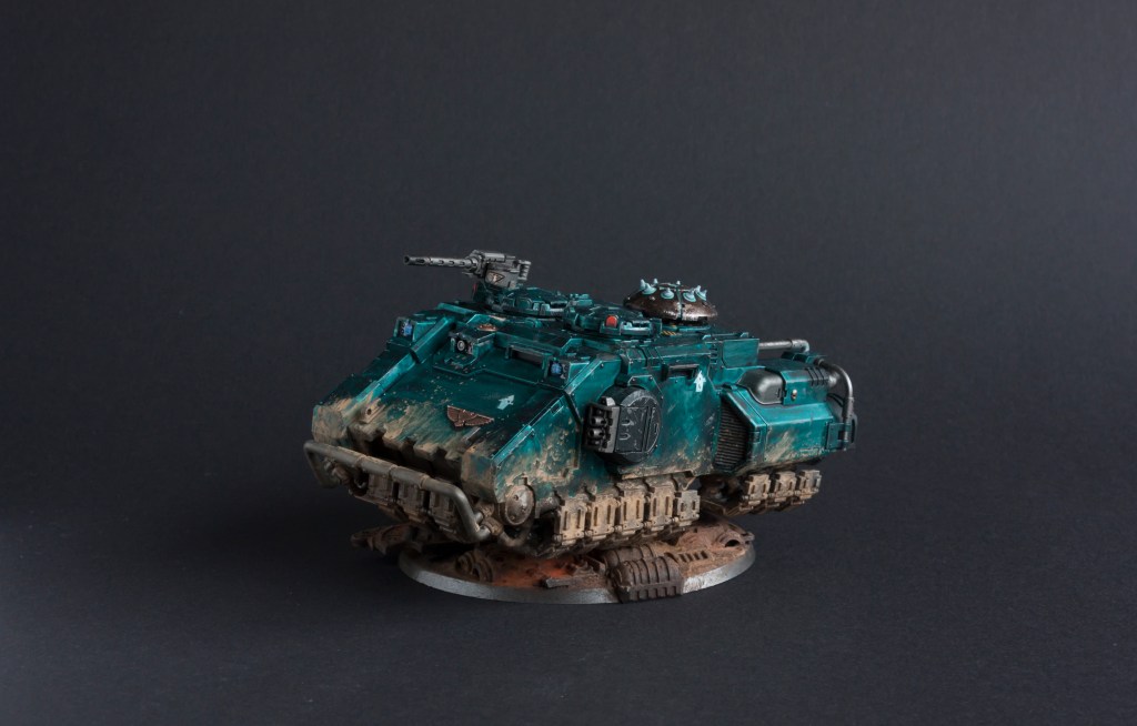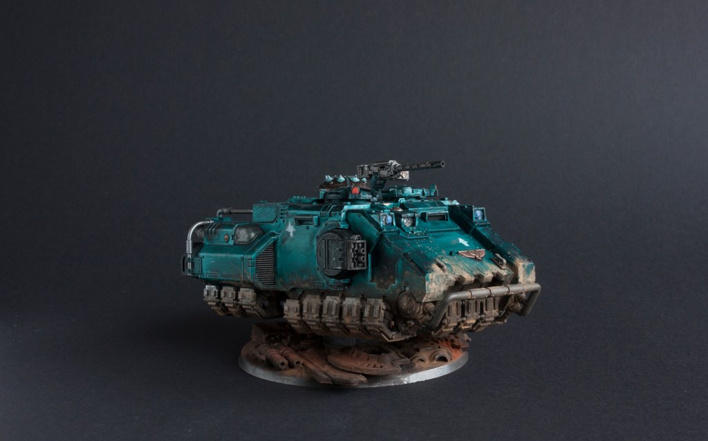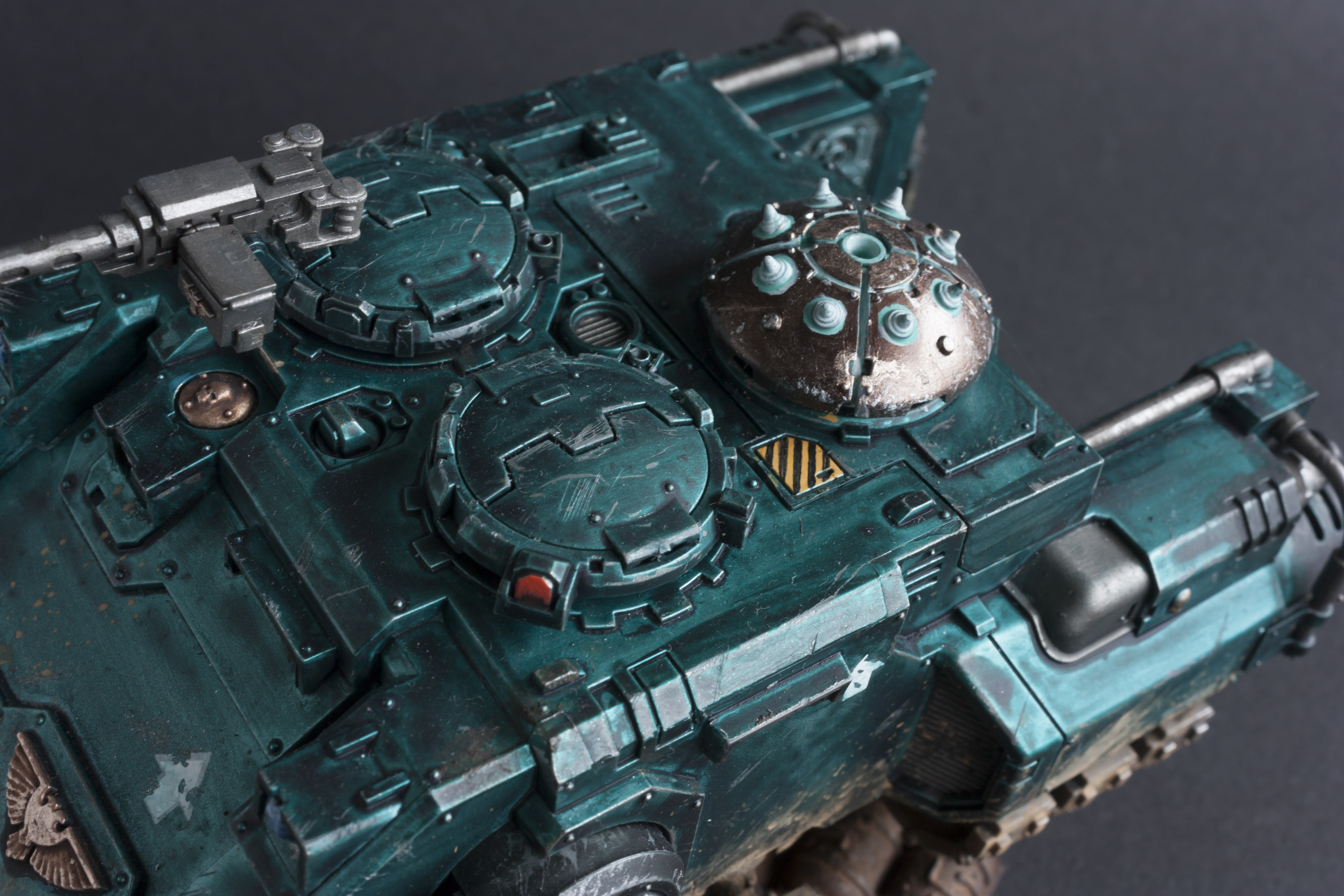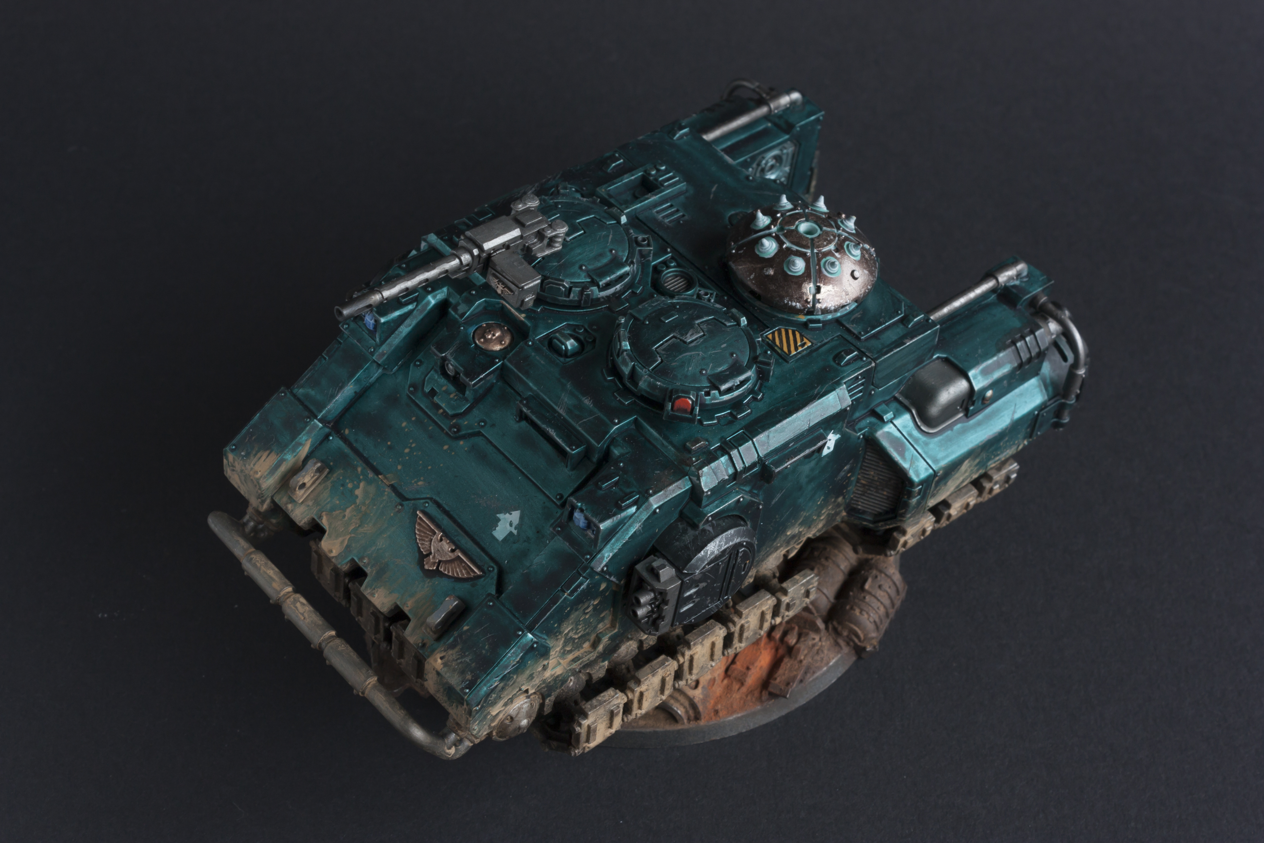The Impulsor was my first tank from the Primaris range. I really enjoyed building it. The paintjob was a little tricky because I don’t own an airbrush. The contrast paint over metallic basecoat pooled here and there a little so the turquoise is darker in some spots. At first I was a bit unhappy with it but now I think it has some kind of weathered look to it and I’m happy with it.