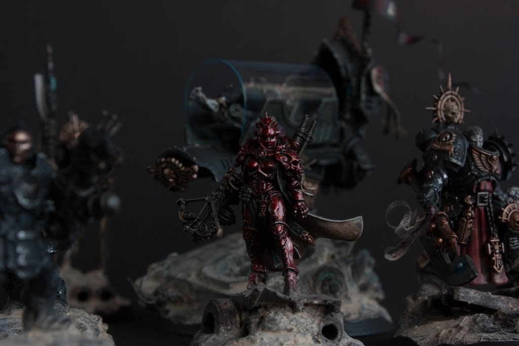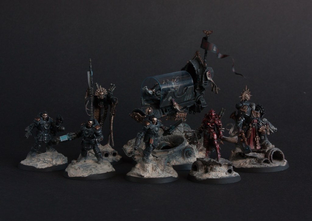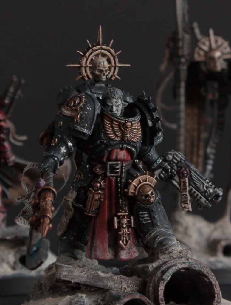With this Warband I approached a rather sinister look. I wanted to transmit the feeling of the grimdark future of the 40k universe with all it’s depth. A lot of flat black colour, gold and metal parts and the striking red of the leader’s armour.